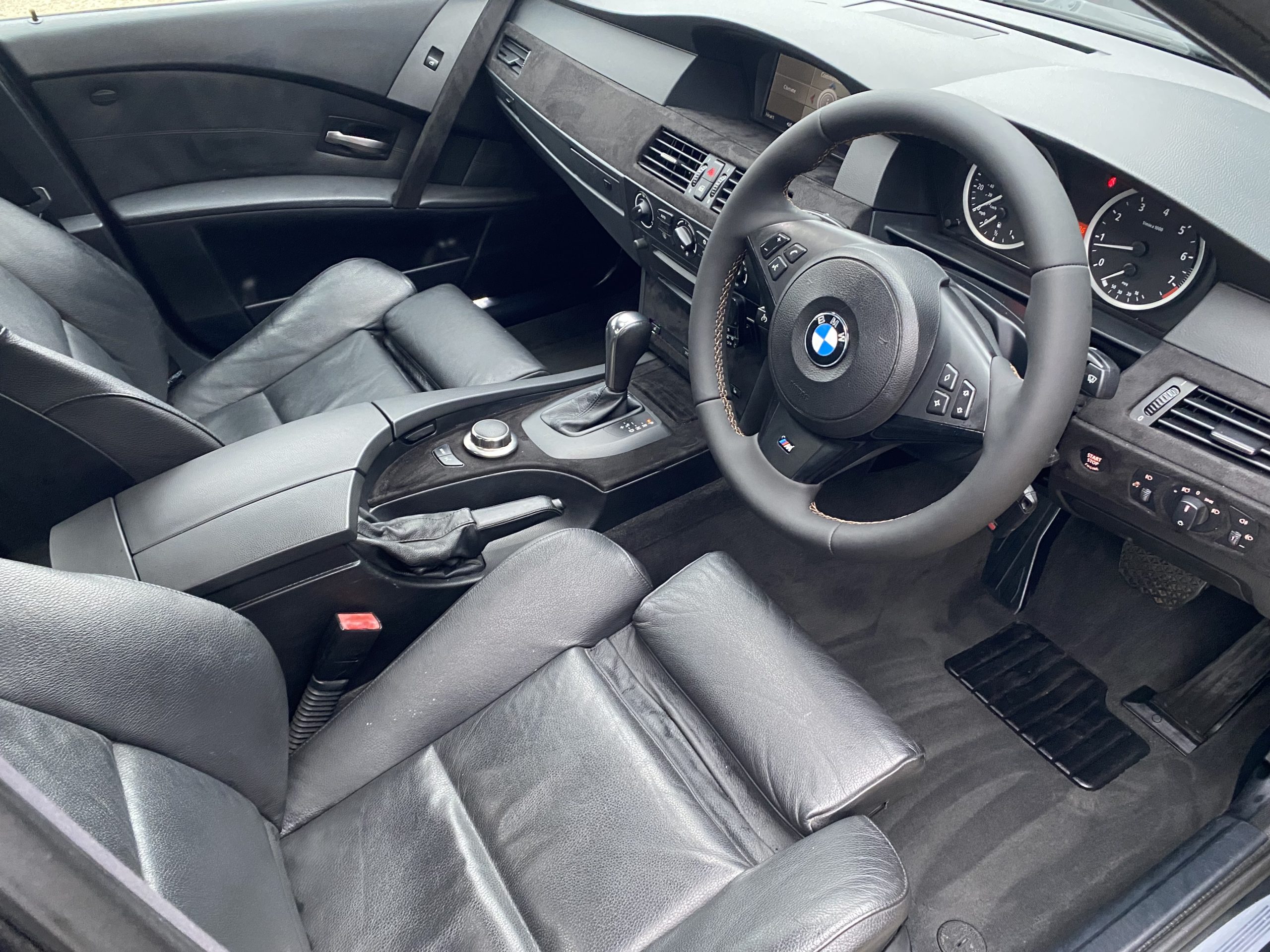 The interior is fitted with heated sports front seats finished in black Dakota leather and M sports leather steering wheel.